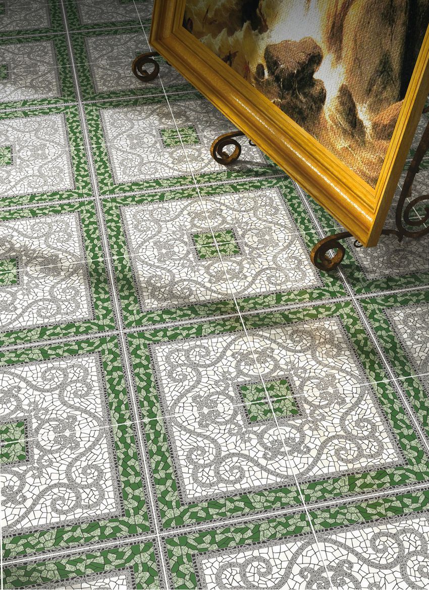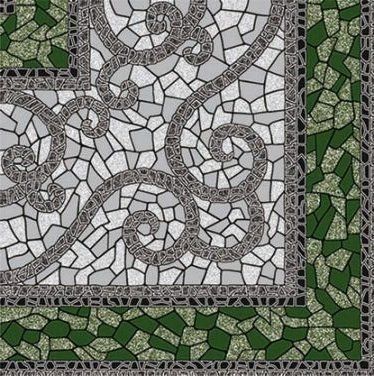 Коллекционная керамическая плитка для пола Византия (Vizantia). Морозостойкая. Размер напольной плитки 300*300мм. Тип поверхности - матовая,рельефная. Представлена в двух вариантах цветов: зеленый и бежевый. Рисунок собирается в пано из четырех плиток.