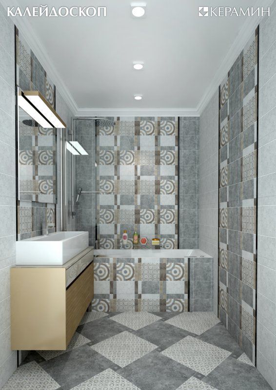 Фото интерьеров комнат, облицованных керамической плиткой Калейдоскоп серый от Керамин.