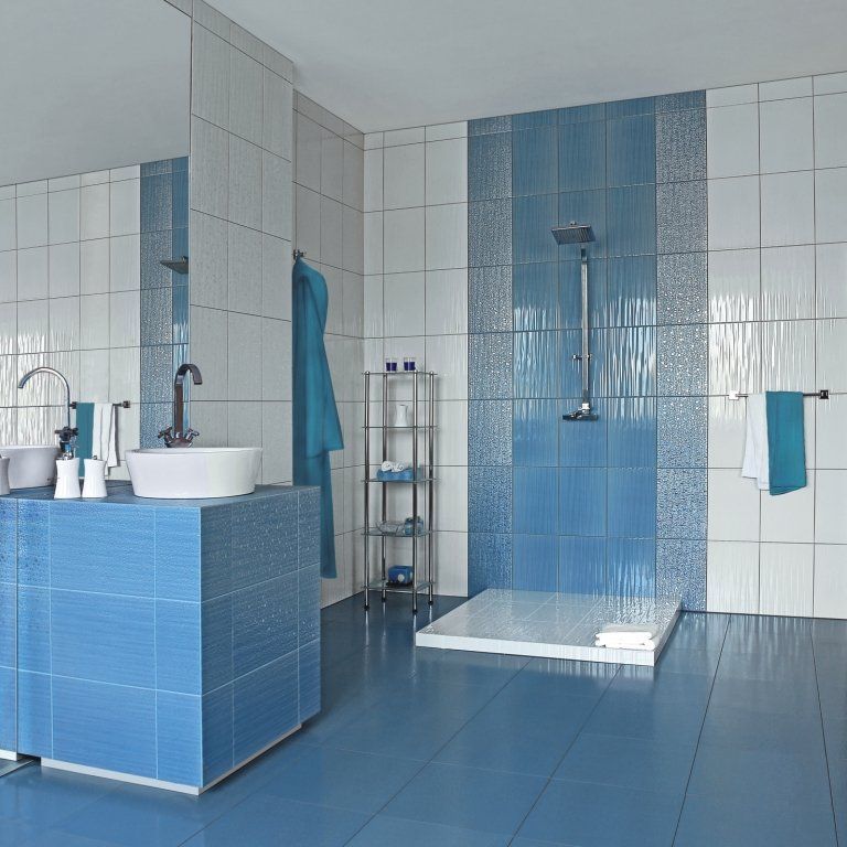 Фото интерьеров комнат, облицованных керамической плиткой Вэйв голубой.