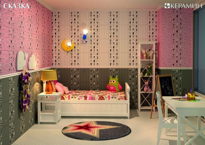 Фото интерьеров комнат, облицованных керамической плиткой Сказка розовый.