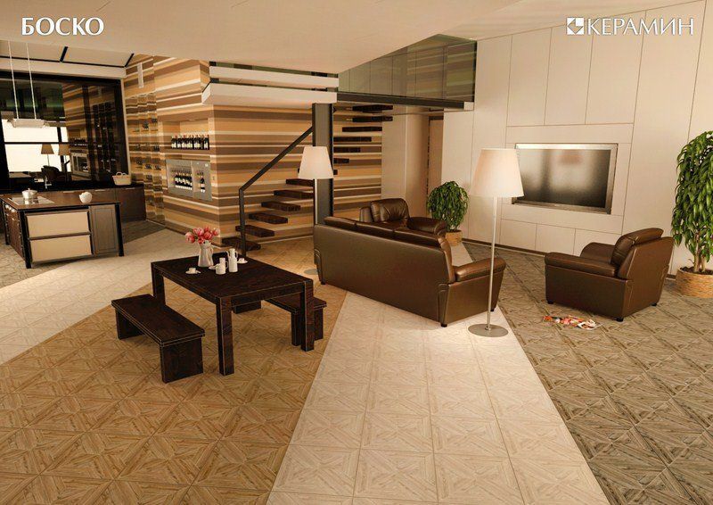 Фото интерьеров комнат, облицованных керамогранитной плиткой Боско (Bosco) от производителя Керамин (Keramin).