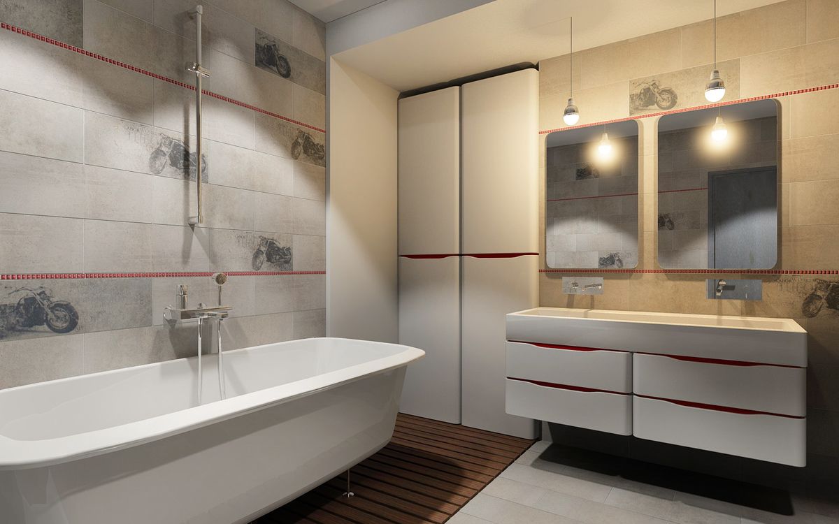 Коллекция выполнена в сером цвете, на выбор есть темная и светлая плитка. На декоративной плитке изображен мотоцикл.