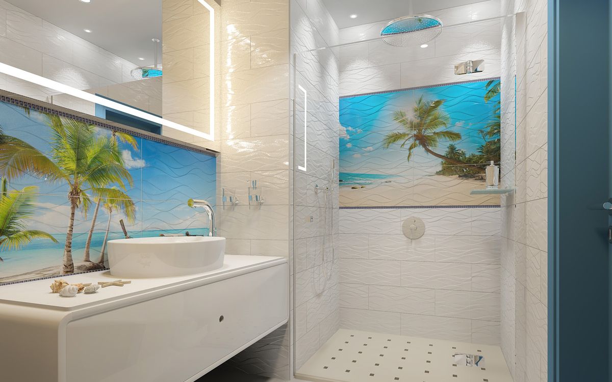 Коллекция стилизованна под камень в оттенках голубого и бежевого цветов. Элементы декорации с продольными волнистыми полосами, растительными мотивами и классическим художественным орнаментом гармонично дополнят композицию интерьера. Коллекция дополнена декоративным панно с райским пейзажем.