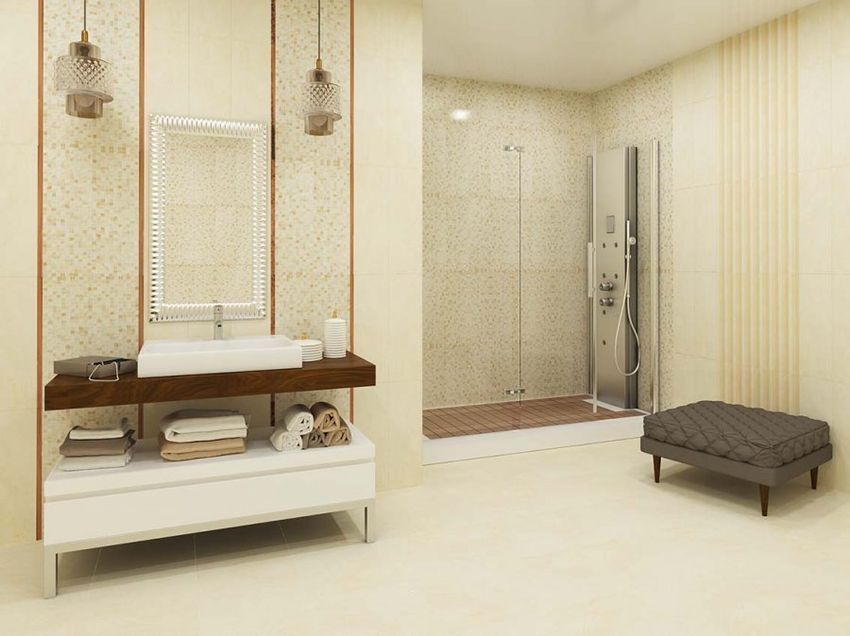 Среди декоративного кафеля можно отметить мозаичный модуль, образованный квадратными каменными чипами в расцветке «микс». Его рельефная поверхность подчеркивает «натуральность» материала и его «ручную сборку». Кроме него в коллекцию вошли две плиты с дамасским орнаментом. При сложении они образуют панно. Оно может быть продолжено в любую из сторон, покрывая всю площадь стены. Шикарной нотой станут стеклянные бордюры-карандаши бежевого и золотого цвета. Они привнесут в проект блеск и прозрачность стекла, сыграют на контрасте с плотной матовой глазурью кафеля.