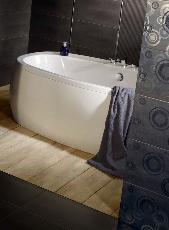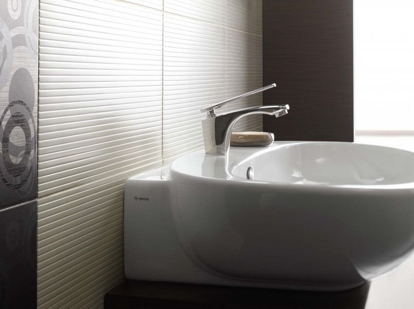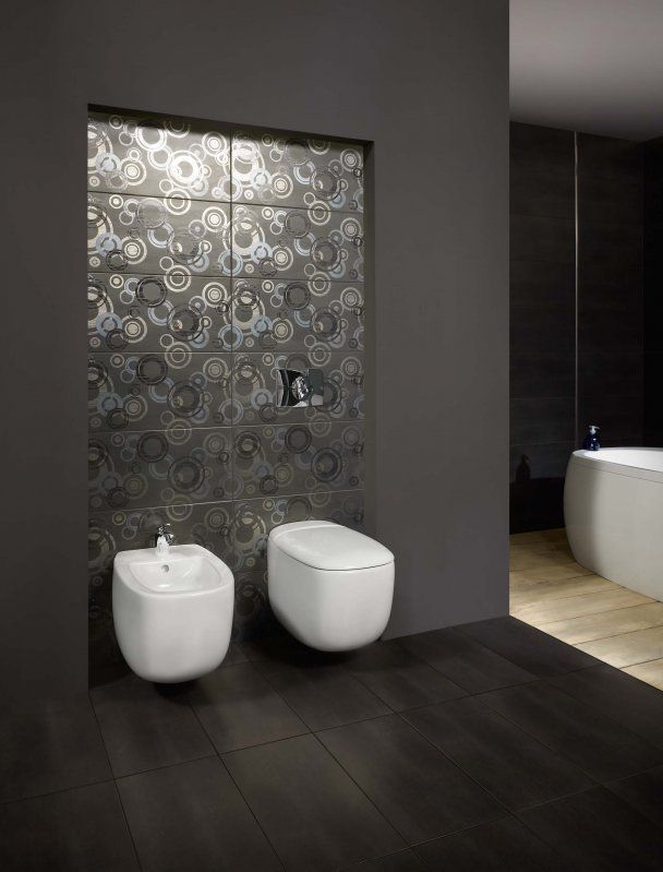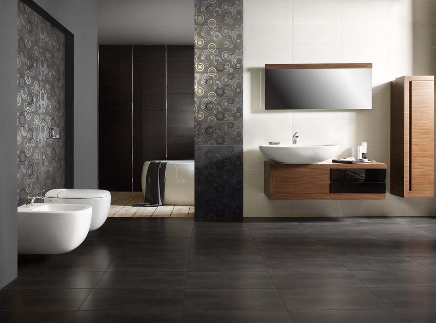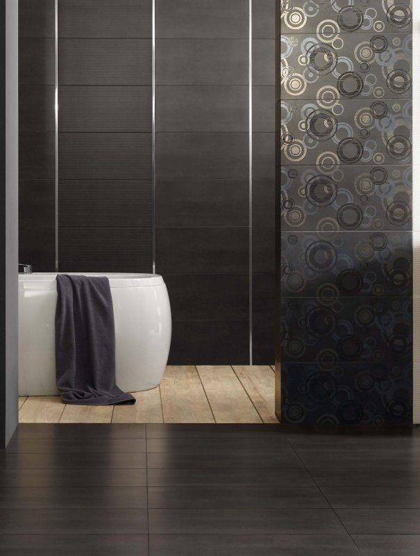 Дизайн этой плитки для ванной простой и в то же время изысканный.Строгие однотонные цвета гармонируют с узорами и стильным геометрическим орнаментом, а яркие бордюры вносят элемент контраста. Основные цвета коллекции – кремовый, коричневый и графитовый.