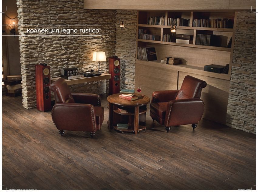 Фото интерьеров комнат, облицованных керамогранитной плиткой Легно (Legno) от производителя Опочно (Opoczno).