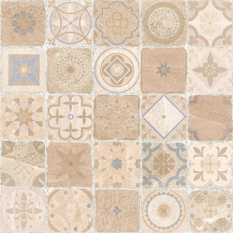 Коллекция выполнена как имитация мозаики из камня. Крупные квадратные чипы будто вырезаны из песчаника разных оттенков бежевого цвета.
