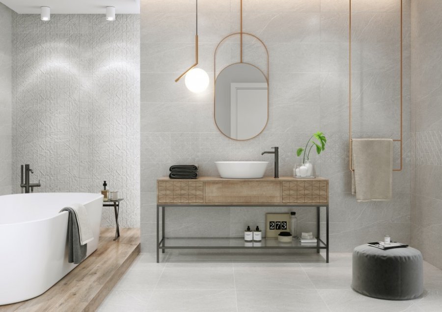 Фото интерьеров комнат, облицованных керамической плиткой Grey Blanket (Грей Бланкет) от производителя Meissen Keramik.