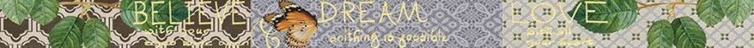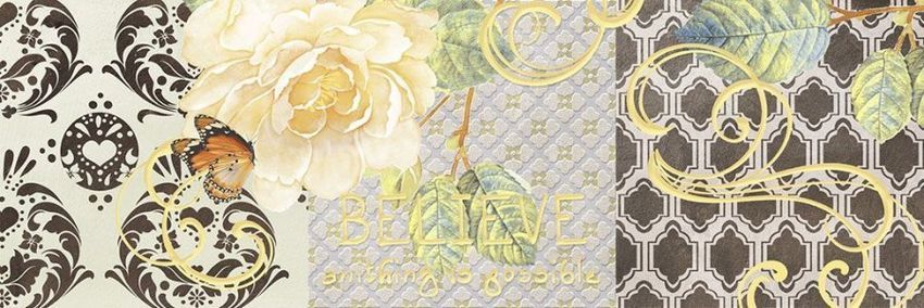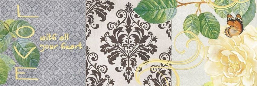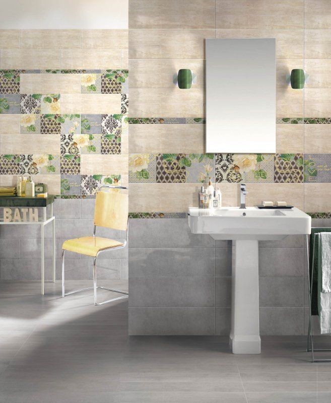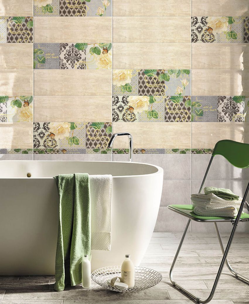 Фоновая настенная плитка имитирует натуральный камень серого и бежевого цвета. Такой рисунок для кафеля очень популярен, он никогда не выходит из моды. Любопытны декоративные элементы, которые сочетают в своем образе технику пэчворк и компьютерную графику. Декоративные модули условно поделены на три части, каждая из которых украшена текстильным принтом, а вот поверх этого фона дизайнеры расположили изображение цветков розы, а также виньетки и надписи на английском языке, отчего вставки стали напоминать поздравительные открытки. В той же стилистике оформлены тонкие бордюры, дополняющие композицию из декораций.