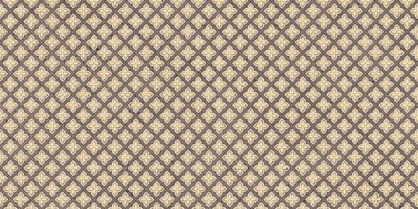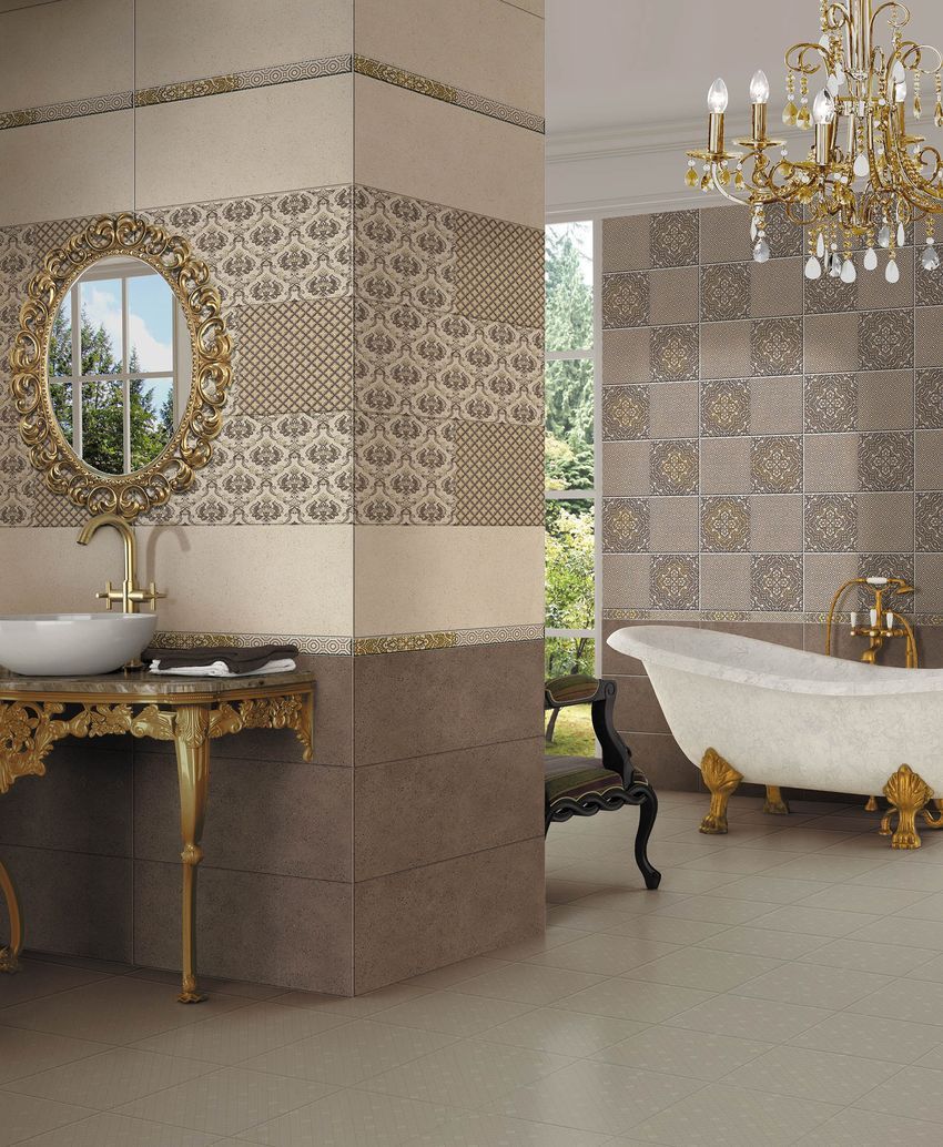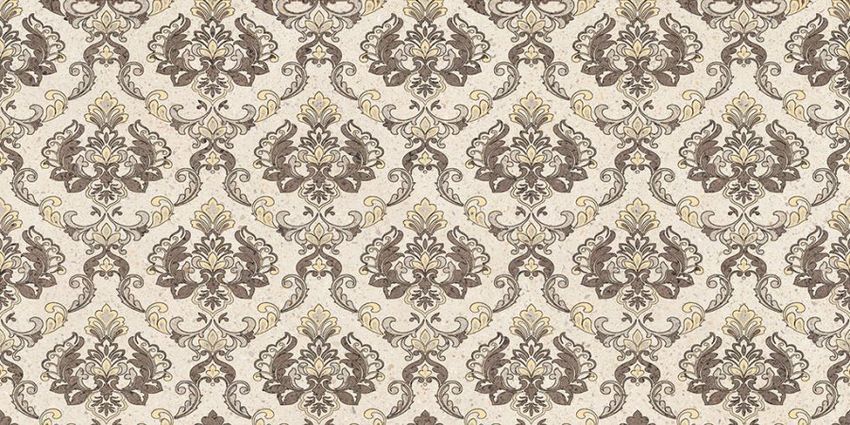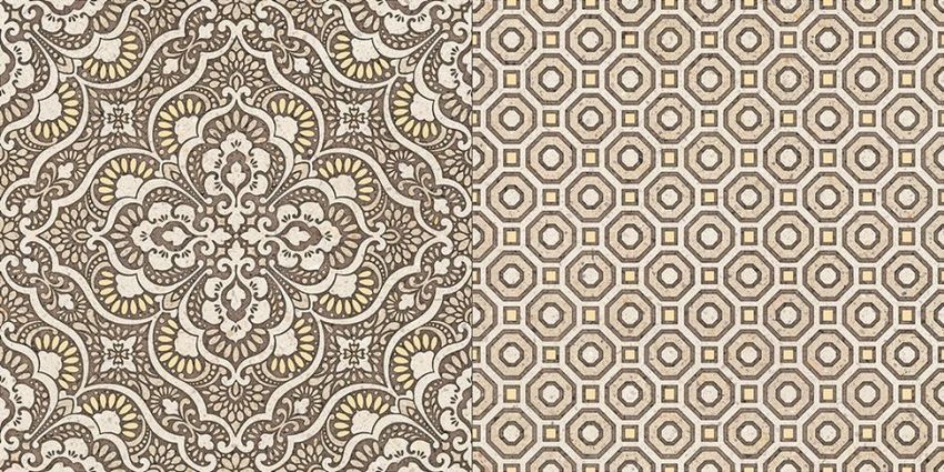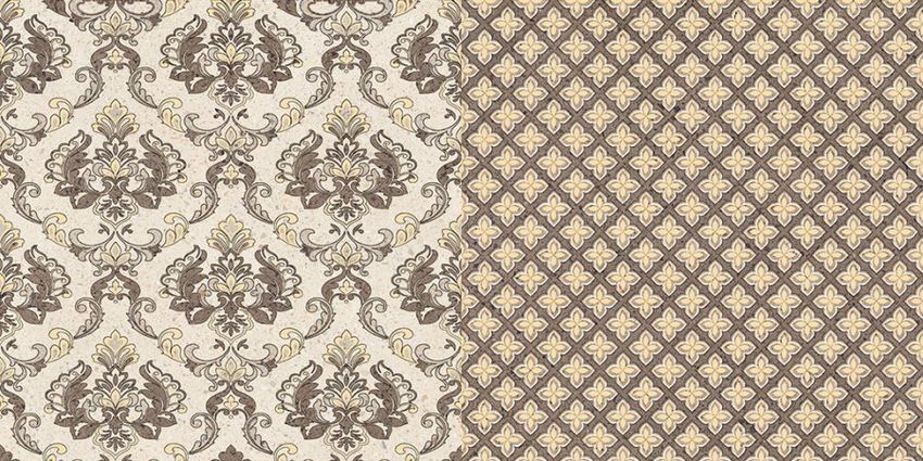 Фоновая настенная плитка выполнена в виде каменных плит бежевого и коричневого цвета. К монохромному кафелю производители добавили орнаментированные модули, один из которых замощен дамасским орнаментом, а другой ромбовидным сетчатым узором. Оба этих принта соединились вместе в декоративном модуле. Другой декор украшен оригинальными орнаментами, поделившими плиту пополам. Завершит проект, стилизованный под интерьеры эпохи Возрождения, напольная плитка, она также имеет «каменную» поверхность и доступна в бежевом и коричневом цвете.