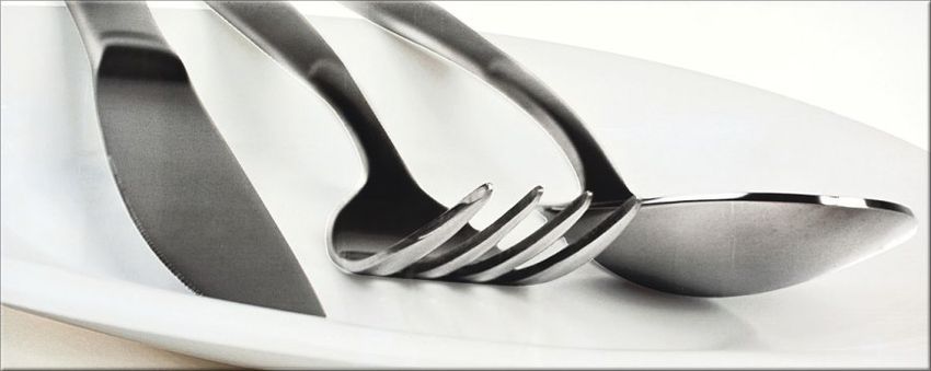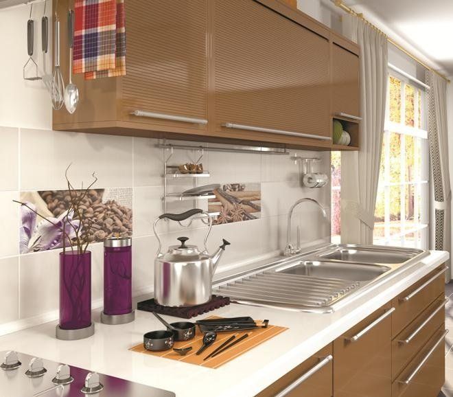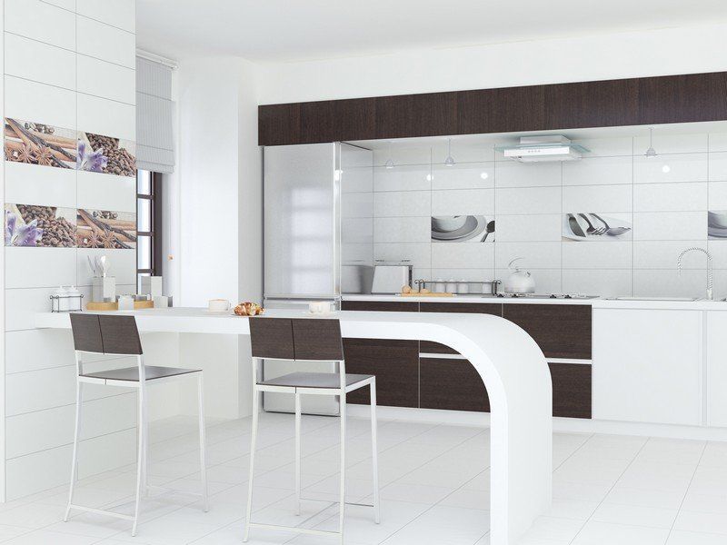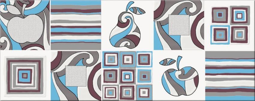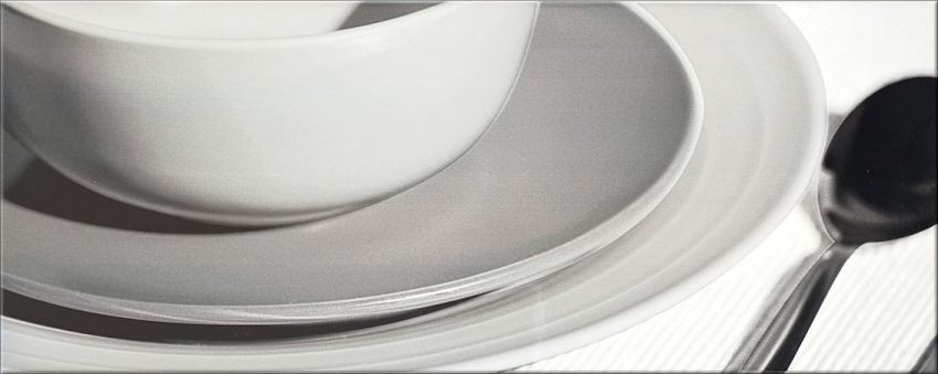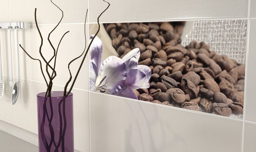 Основной фон – кипенно белый, залит перламутровой тонкой «сеткой». Широкий выбор декоров, совершенно различных по стилю и характеру делает Ваш выбор уникальным и создает особый ритм и стиль. Это может быть строгий минимализм (декоры в виде фрагментов черно-белой фотографии с изображением предметов сервировки стола) или стиль этники (декоры выполнены как декоративный орнамент в бордовом или голубом цвете). Любителям кофе очень понравятся изящные декоры-натюрморты с кофейными зернами и натуралистичным изображением нежного, словно живого, благоухающего цветка ириса.