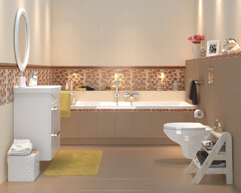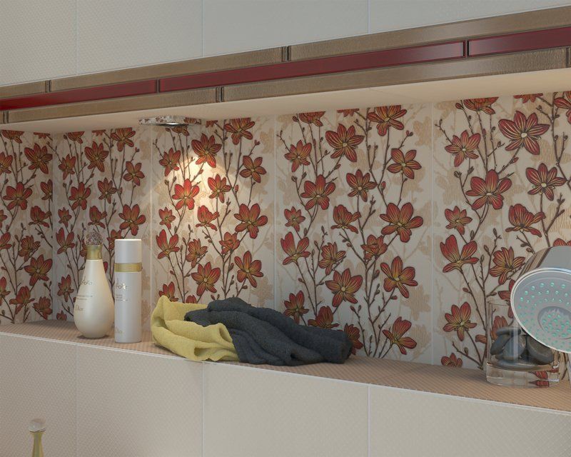Облицовочная плитка выполнена в бежевом и бежево-коричневом цветах. Ее полотно украшает мелкий едва заметный геометрический узор. Матовая напольная плитка с таким же принтом доступна в бежево-коричневом цвете и относится к третьей группе износостойкости. На декоративной плитке изображены цветы.
