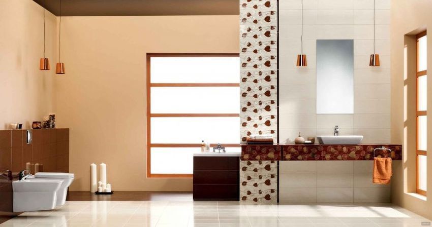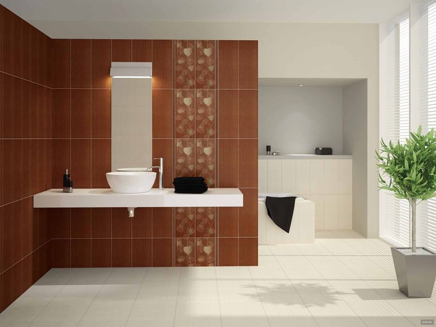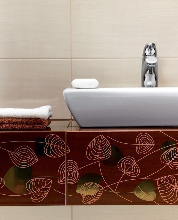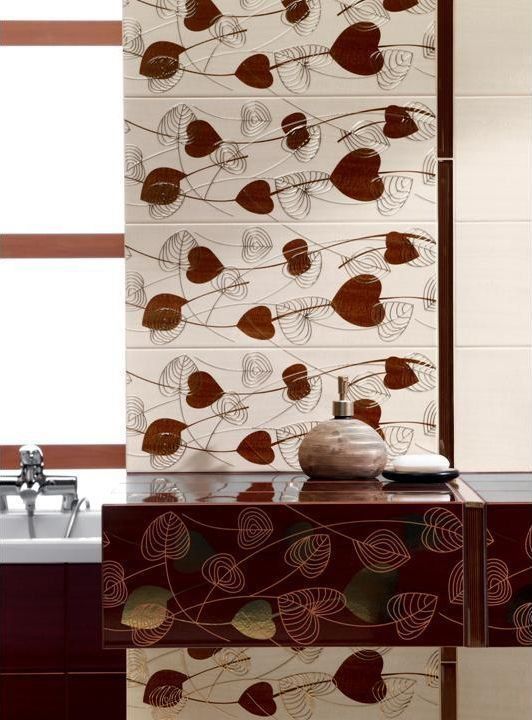Благодаря использованию контраста между светлыми и коричневыми оттенками плитки, можно без труда расставить акценты в ванной комнате любой площади. Крупные листы, напоминающие сердечки, создают соответствующее романтическое настроение. Тончайшие нити, сплетающиеся между собой в один чудесный рисунок, создают имитацию волшебного ковра из осенних листьев.