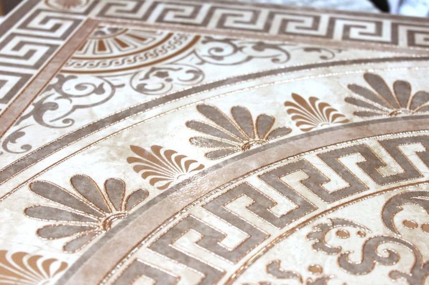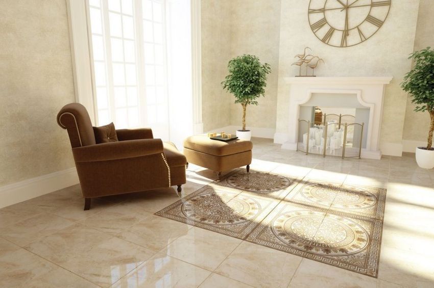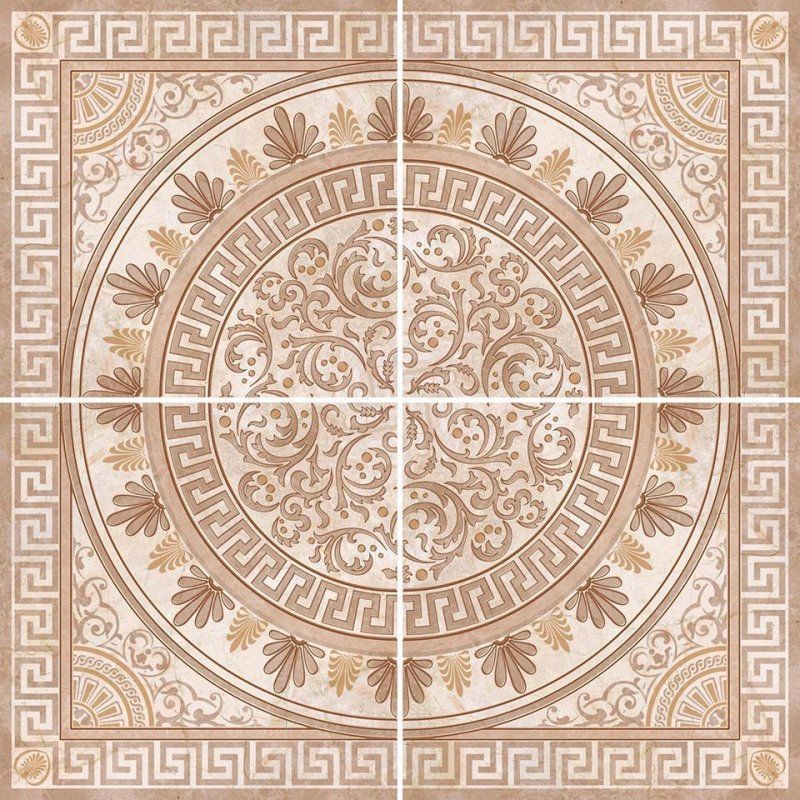 Панно, дополняющее напольную плитку, украшено классическим розоном, орнамент которого подчёркнут рельефом блестящей глазури. Декор позволяет превратить обычное напольное покрытие в керамический ковёр удивительной красоты.