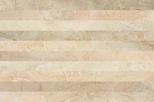 Коллекция представлена напольной и настенной керамикой, имитирующей поверхность мрамора, с декоративными элементами: это кафель, поверхность которого воспроизводит мозаичную раскладку из разнофактурных элементов, классический декор с вензелем по центру, плита с полосатым рисунком по мраморному фону, напоминающая обои.