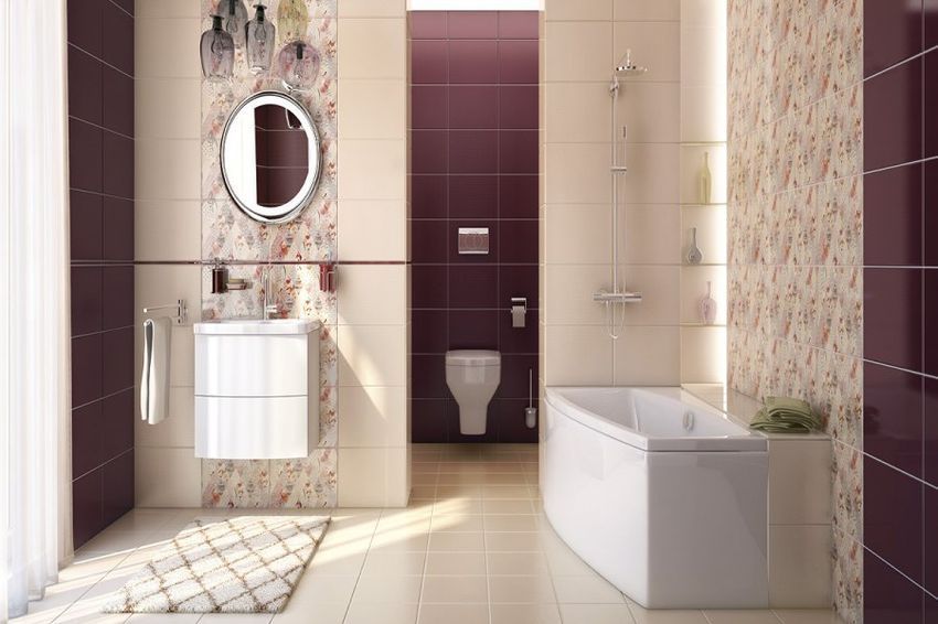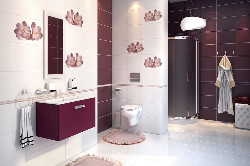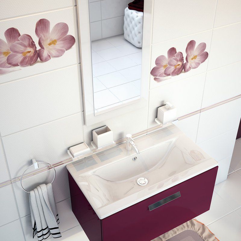 Яркие и насыщенные цвета базовых плиток коллекции создают быстрый ритм в сопряжены с декорацией. А приглушенная декорация Modern делает то же цвет спокойным и неторопливым. Благодаря бархатного бордового цвета любая ванная комната с обычной может превратиться в королевскую.