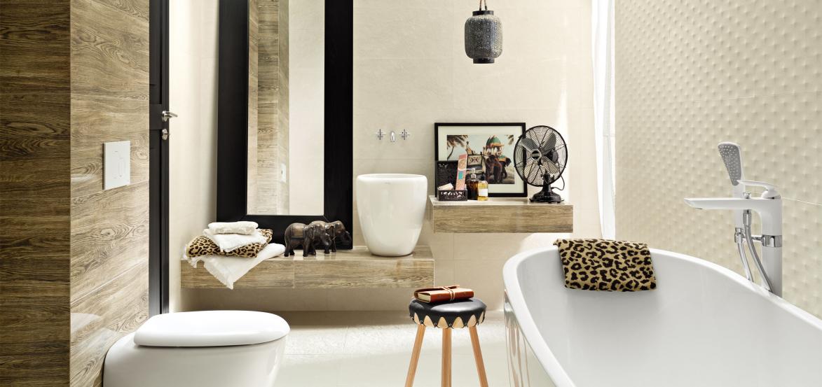 Фото интерьеров комнат, облицованных керамической плиткой Терране (Terrane) от производителя Тубадзин (Tubadzin).